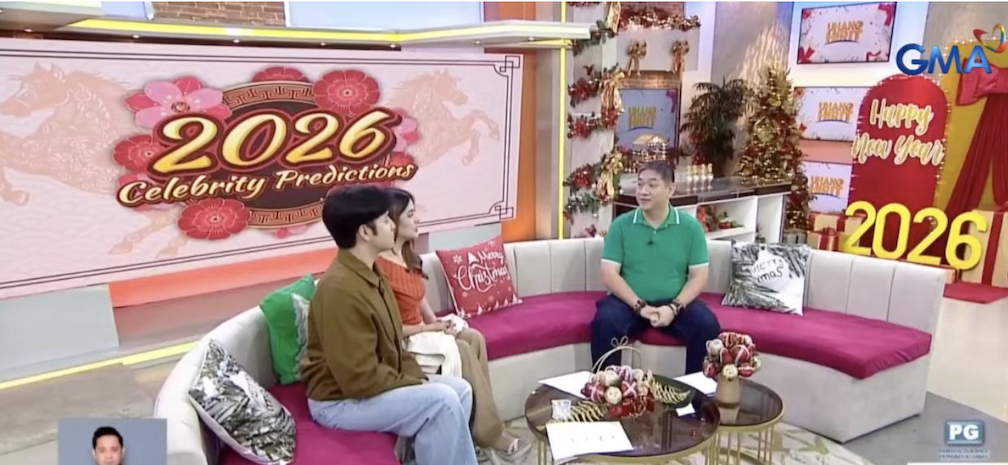 Johnson Cheng (in green shirt) sharing his predictions for Kapuso celebrities at GMA 7’s Unang Hirit