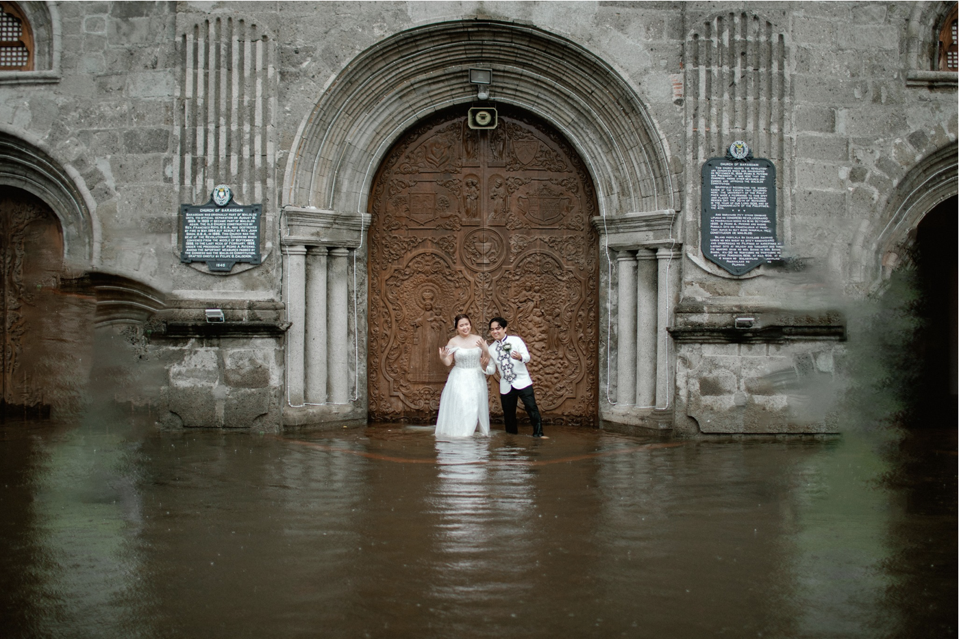 Rick Verdillo and Jamaica Aguilar outside a flooded Barasoain Church in Bulacan after their wedding ceremony