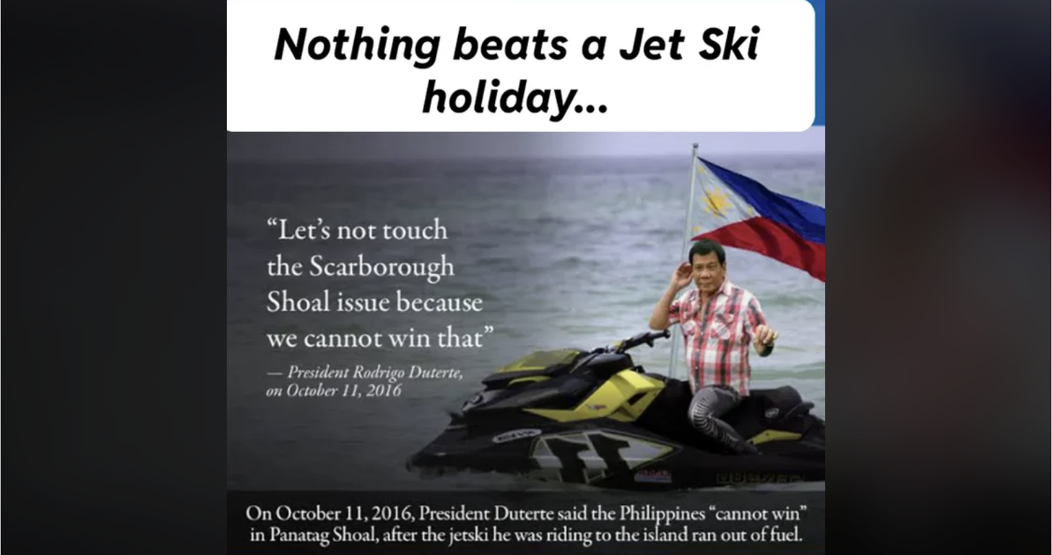 The heart of the joke was a parody riffing on the popular “Jet2 holiday” meme, cleverly intertwined with references to former President Rodrigo Duterte’s famous but unfulfilled campaign promise to ride a jet ski to the Spratly Islands in the West Philippine Sea.